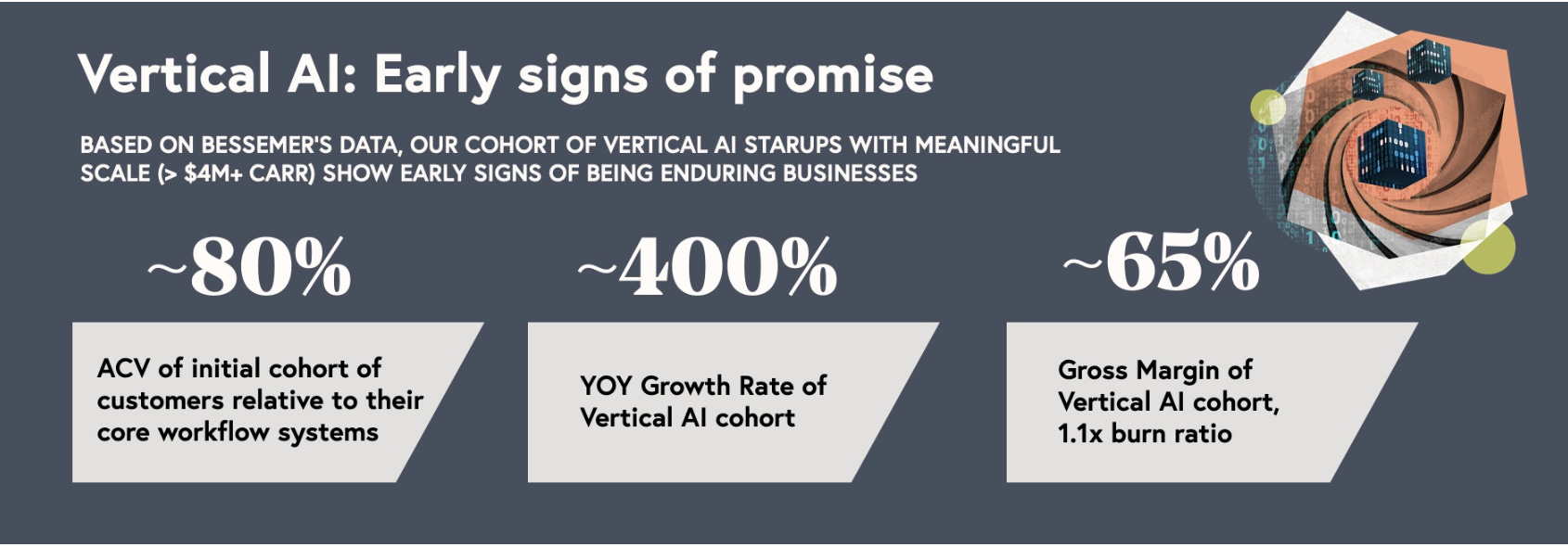 Bessemer's numbers on vertical AI likely reflect an antebellum period, where companies are adopting AI tools to cut costs and improve workflows ahead of the full arrival of AI Agents and AGI. This phase marks a transition—businesses experiment with AI for incremental gains while bracing for a future where autonomous systems will redefine software development.